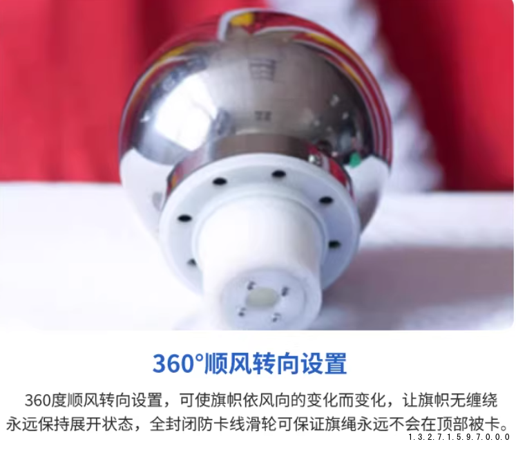 郑州旗杆球头配件,360度顺风转向设置,可使旗帜依风向的变化而变化,让旗帜无缠绕永远保持展开状态,全封闭防卡线滑轮可保证旗绳永远不会在顶部被卡。