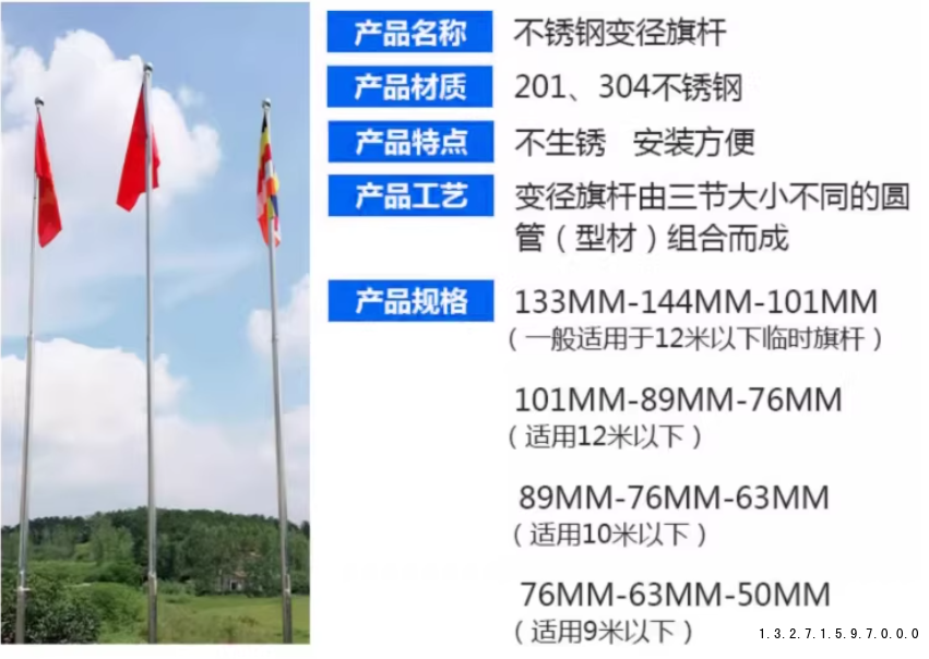 郑州三节旗杆生产厂家,不锈钢变径旗杆201、304不锈钢不生锈安装方便变径旗杆由三节大小不同的圆管(型材)组合而成133MM-144MM-101MM(一般适用于12米以下临时旗杆)101MM-89MM-76MM(适用12米以下)89MM-76MM-63MM(适用10米以下)76MM-63MM-50MM(适用9米以下)。